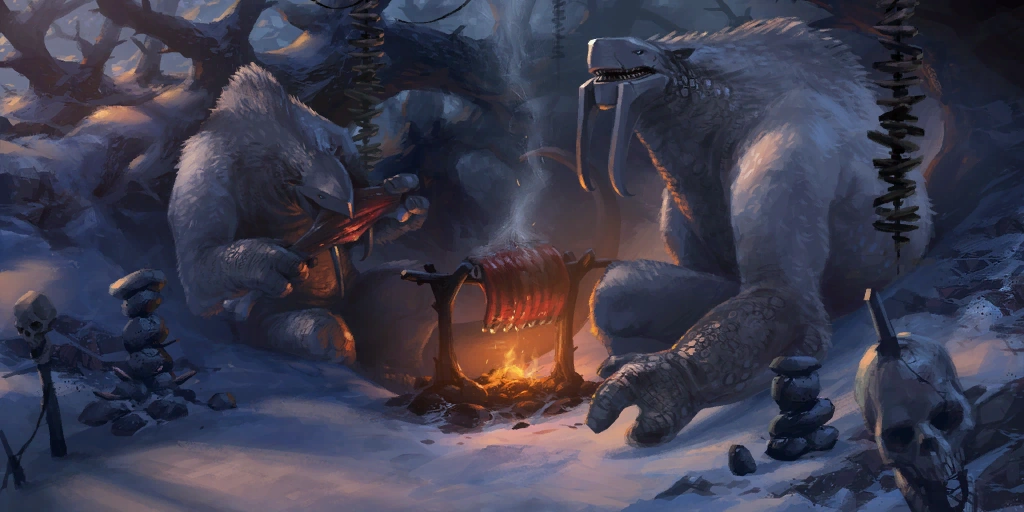 The origins of this species are found in a pack of wolves that were driven into inhospitably high tundra after losing a series of fights with the Drakken. Infected by Dust, their new form has rendered them indifferent to the coldest environments and seasons. Geldirus villages are simple things, befitting a simple people. Often carved from slabs of snow or fitted rocks plugged with mud, their towns are more for storage and social connections than warmth and defense.